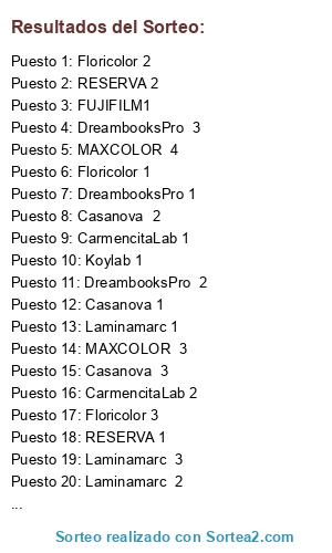 Lista de participantes: FUJIFILM1, FUJIFILM2, FUJIFILM3, MAXCOLOR 1, MAXCOLOR 2, MAXCOLOR 3, MAXCOLOR 4, DreambooksPro 1, DreambooksPro 2, DreambooksPro 3, Casanova 1, Casanova 2, Casanova 3, Laminamarc 1, Laminamarc 2, Laminamarc 3, Floricolor 1, Floricolor 2, Floricolor 3, Colorex 1, CarmencitaLab 1, CarmencitaLab 2, Koylab 1, RESERVA 1, RESERVA 2, .