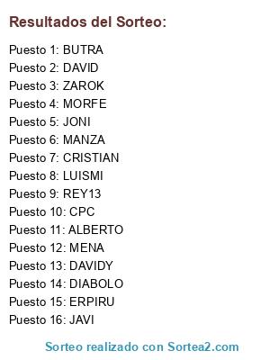 Lista de participantes: JONI, JAVI, MENA, ERPIRU, MANZA, CPC, LUISMI, MORFE, REY13, DIABOLO, DAVIDY, ZAROK, ALBERTO, CRISTIAN, BUTRA, DAVID.