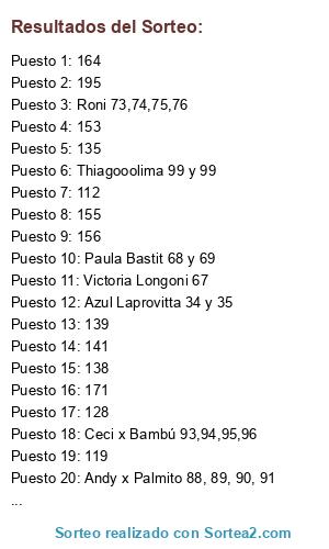 Lista de participantes: Johanna Alejandra Dolores Rodriguez 01, 02, 03, 21,28,86, Miryam Pozatti 05, 06, Ana M. Lound 07,08,09,10, Ceci por Bambú 11, 12, 13, 14, Lucía Caruso 15 y 16, Susana Montel 17 y 19, Malala 18 y 20, Walter Risteau 22, 23, Ana refu feliz 04, 24, Sole Amaya 25, 26, Bianca 27 y 29, Susana Massi 30; 31, Mama Sol Amaya 32 y 33, Azul Laprovitta 34 y 35, Marta prima Susana Montel 36, Flavia Busnelli 37,38,39,40,41,42,43,44,45,46,47,48,49,50, Lorena Peinados 51 y 52, 53, 54, 55, 56, 57, 58, 59, 60, 61, 62, 63, 64, Vani 65 y 66., Victoria Longoni 67, Paula Bastit 68 y 69, Sany. 70 y 71, Jess Medina 72, Roni 73,74,75,76, Malena 77 y 78, Milagros Zapata 79, María Monfort 80, 81, 82,83, Estela Rodriguez 84, Carla Marquez 85, 87, Andy x Palmito 88, 89, 90, 91, Gabriela Chornobroff 92, Ceci x Bambú 93,94,95,96, Juan bernasconi 97, Thiagooolima 99 y 99, Aldana Sampayo 100, 101,102, 104, Graciela Garófalo 105, Marta B 106 y 107, Mirian colchoncitos 108 y 109, Mariana Ceballos 110 y 111, Alejandra Romero 103 y 126., 112, 113, 114, 115, 116, 117, 118, 119, 120, 121, 122, 123, 124, 125, 127, 128, 129, 130, 131, 132, 133, 134, 135, 136, 137, 138, 139, 140, 141, 142, 143, 144, 145, 146, 147, 148, 149, 150, 151, 152, 153, 154, 155, 156, 157, 158, 159, 160, 161, 162, 163, 164, 165, 166, 167, 168, 169, 170, 171, 172, 173, 174, 175, 176, 177, 178, 179, 180, 181, 182, 183, 184, 185, 186, 187, 188, 189, 190, 191, 192, 193, 194, 195, 196, 197, 198, 199, 200.