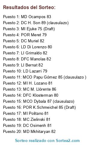 Lista de participantes: POR K.Schmeichel 85 (Draft), POR Meret 79, LD Lazarri 79, LD Di Lorenzo 80, DFC Manolas 82, DFC Klosterman 80, LI Grimaldo 82, LI Bernat 82, MC M. Llórente 86, MC Zielinski 81, MCO Papu Gómez 85 (clausulazo ), MCO Dybala 87 (clausulazo), MD Mkhitaryan 82, MD Ocampos 83, MI Politano 81, MI H. Lozano 81, MI Ejuke 75 (Draft), DC Muriel 82, DC Osimenh 81, DC H. Son 89 (clausulazo).