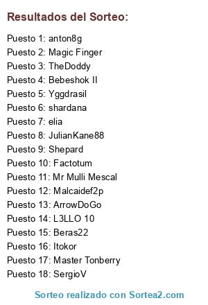Lista de participantes: JulianKane88, ArrowDoGo, L3LLO 10, Malcaidef2p, shardana, Yggdrasil, Magic Finger, elia, Factotum, Mr Mulli Mescal, SergioV, Master Tonberry, Shepard, Bebeshok II, Itokor, Beras22, TheDoddy, anton8g.