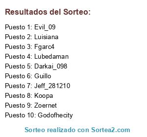 Lista de participantes: Koopa, Zoernet, Luisiana, Jeff_281210, Fgarc4, Godofhecity, Lubedaman, Guillo, Evil_09, Darkai_098.