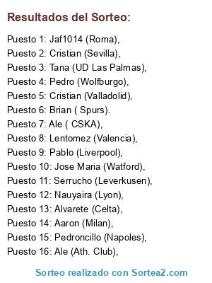 Lista de participantes: Cristian (Sevilla),, Nauyaira (Lyon),, Pedroncillo (Napoles),, Serrucho (Leverkusen),, Pablo (Liverpool),, Jose Maria (Watford),, Jaf1014 (Roma),, Pedro (Wolfburgo),, Tana (UD Las Palmas),, Ale (Ath. Club),, Alvarete (Celta),, Aaron (Milan),, Cristian (Valladolid),, Lentomez (Valencia),, Ale ( CSKA),, Brian ( Spurs)..