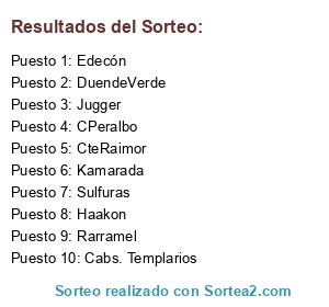Lista de participantes: Cabs. Templarios, DuendeVerde, Haakon, Sulfuras, CPeralbo, Kamarada, CteRaimor, Edecón, Rarramel, Jugger.