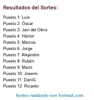 Lista de participantes: Luis, Mario, DaniG, Javi del Olmo, Josemi, Jorge, Óscar, Héctor, Alejandro, Ricardo, Rubén, Marcos.