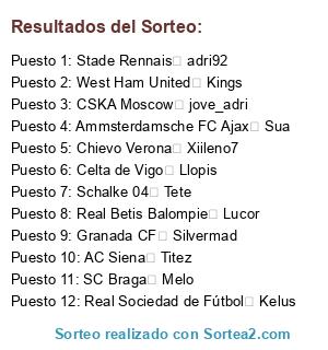 Lista de participantes: Real Sociedad de Fútbol Kelus, Granada CF Silvermad, Celta de Vigo Llopis, Ammsterdamsche FC Ajax Sua, Real Betis Balompie Lucor, West Ham United Kings, SC Braga Melo, Schalke 04 Tete, Chievo Verona Xiileno7, Stade Rennais adri92, CSKA Moscow jove_adri, AC Siena Titez.