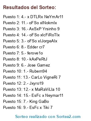 Lista de participantes: 1.- Rubern94, 2.- Jxyro19, 3.- oFSo xIJorgeAIx, 4.- x DTLRx NeYmAr11, 5.- ferove1o, 6.- Jose Gamez, 7.- King GaBo, 8.- Edder cr7, 9.- EsFc x Tiki 7, 10.- kAxPeRtJ, 11.- oFSo xINokmIx, 12.- x MaRaViLla 10, 13.- CarLo VigneRi 7, 14.- oFSo xIcFiRoTIx, 15.- EsFc x Neymar11, 16.- AxSxP Yrsinho 9.