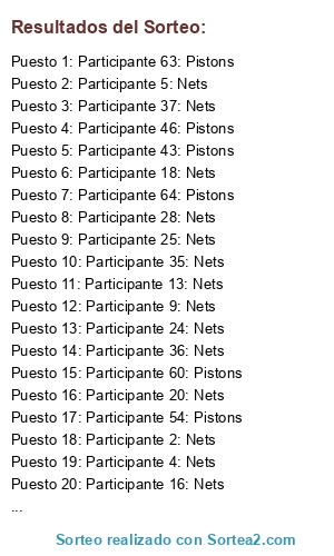 Lista de participantes: Participante 1: Nets, Participante 2: Nets, Participante 3: Nets, Participante 4: Nets, Participante 5: Nets, Participante 6: Nets, Participante 7: Nets, Participante 8: Nets, Participante 9: Nets, Participante 10: Nets, Participante 11: Nets, Participante 12: Nets, Participante 13: Nets, Participante 14: Nets, Participante 15: Nets, Participante 16: Nets, Participante 17: Nets, Participante 18: Nets, Participante 19: Nets, Participante 20: Nets, Participante 21: Nets, Participante 22: Nets, Participante 23: Nets, Participante 24: Nets, Participante 25: Nets, Participante 26: Nets, Participante 27: Nets, Participante 28: Nets, Participante 29: Nets, Participante 30: Nets, Participante 31: Nets, Participante 32: Nets, Participante 33: Nets, Participante 34: Nets, Participante 35: Nets, Participante 36: Nets, Participante 37: Nets, Participante 38: Nets, Participante 39: Nets, Participante 40: Nets, Participante 41: Pistons, Participante 42: Pistons, Participante 43: Pistons, Participante 44: Pistons, Participante 45: Pistons, Participante 46: Pistons, Participante 47: Pistons, Participante 48: Pistons, Participante 49: Pistons, Participante 50: Pistons, Participante 51: Pistons, Participante 52: Pistons, Participante 53: Pistons, Participante 54: Pistons, Participante 55: Pistons, Participante 56: Pistons, Participante 57: Pistons, Participante 58: Pistons, Participante 59: Pistons, Participante 60: Pistons, Participante 61: Pistons, Participante 62: Pistons, Participante 63: Pistons, Participante 64: Pistons, Participante 65: Pistons, Participante 66: Pistons, Participante 67: Pistons, Participante 68: Pistons, Participante 69: Pistons, Participante 70: Pistons, Participante 71: Pistons, Participante 72: Pistons, Participante 73: Pistons.