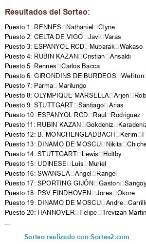 Lista de participantes: AJAX Jordy Clasie, RENNES Marcos Rojo, AJAX Fabian Delph, AJAX Adam Maher, AJAX Daley Blind, AJAX Cristian Tello, AJAX Ilkay Gundogan, PSV Ricardo Van Rhijn, AJAX Luciano Narsingh, WERDER BREMEN Marco Van Ginkel, SAO PAULO Eyong Enoh, PALERMO Derk Boerrigter, AJAX Viktor Fischer, AJAX Andre Felipe Ribeiro de Souza, AJAX Danilo Larangeria, AJAX Ryan Bertrand, AJAX Mario Mandzukic, AJAX Bruno Martins Indi, AJAX Serge Aurier, AJAX Michael Rensing, AJAX Juan Ghilherme Nunes Jesus, AJAX Itumeleng Khune, ANDERLECHT Sebastian Jung, ANDERLECHT Kevin Trapp, ANDERLECHT Moritz Leitner, ANDERLECHT Wellington Nem, ANDERLECHT Didier Drogba, ANDERLECHT Serigne Kara, ANDERLECHT Matias Suarez, ANDERLECHT Cheikhou Kouyate, ANDERLECHT Silvio Proto, ANDERLECHT Bram Nuytinck, ANDERLECHT Behrang Safari, ANDERLECHT Denis Odoi, ANDERLECHT Dennis Praet, ANDERLECHT Massimo Bruno, ANDERLECHT Cyriac Gohi Bi, ANDERLECHT Dieumerci Mbokani, ANDERLECHT Adryan Oliveira Tavares, ANDERLECHT Marcos (Marquinhos) Aoas Correa, ANDERLECHT Joao Miranda de Souza, ANZHI Jano Ananidze, ANZHI Georgi Schennikov, ANZHI Mbark Boussoufa, ANZHI Jose Maria Callejon, ANZHI Christopher Samba, ANZHI Samuel Eto'o, ANZHI Lass Diarra, ANZHI Nicolas Nkoulou, ANZHI Kamil Agalarov, ANZHI Odil Akhmedov, ANZHI Mehdi Carcela-Gonzalez, ANZHI Ewerton, ANZHI Vladimir Gabulov, ANZHI Ali Gadzhibekov, ANZHI Jucilei, ANZHI Arseni Logashov, ANZHI Sharif Mukhammad, ANZHI Evgeni Pomazan, ANZHI Oleg Shatov, ANZHI Yuri Zhirkov, ANZHI Nikita Burmistrov, ANZHI Cristian Pasquato, ANZHI Nnamdi Oduamadi, ASTON VILLA Ciaran Clark, ASTON VILLA Aiden McGeady, ASTON VILLA Ryan Babel, ASTON VILLA Fabrizio Miccoli, ASTON VILLA Loic Remy, ASTON VILLA Andres Guardado, ASTON VILLA Javier Chicharito, ASTON VILLA Sebastian Rode, ASTON VILLA Felipe Santana, ASTON VILLA Idriss Carlos Kameni, ASTON VILLA Roland Lamah, ASTON VILLA Abdoulay Konko, ASTON VILLA Brad Guzan, ASTON VILLA Karim El Ahmadi, ASTON VILLA Mariano Ferreira Filho, ASTON VILLA Huga Ayala, ASTON VILLA Davy Claude Angan, ASTON VILLA Maximiliano Moralez, ASTON VILLA Eder Antonio Macedo Lopes, ASTON VILLA Imoh Ezequiel, ASTON VILLA Stefan Radu, ATH. BILBAO Carles Puyol, ATH. BILBAO Sergio Canales, ATH. BILBAO Andoni Iraola, ATH. BILBAO Mikel San Jose, ATH. BILBAO Fernando Amorebieta, ATH. BILBAO Markel Susaeta, ATH. BILBAO Iker Muniain, ATH. BILBAO Aritz Aduriz, ATH. BILBAO Fernando Llorente, ATH. BILBAO Mikel Arteta, ATH. BILBAO Nacho Monreal, ATH. BILBAO Ander Iturraspe, ATH. BILBAO Oscar De Marcos, ATH. BILBAO Vieirinha, ATH. BILBAO Iñigo Perez, ATH. BILBAO Raul Fernandez, ATH. BILBAO Xabier Castillo, ATH. BILBAO Carlos Gurpegi, ATH. BILBAO Isma Lopez, ATH. BILBAO Mario Suarez, ATH. BILBAO Roberto Jimenez, B. MONCHENGLADBACH Leroy Fer, B. MONCHENGLADBACH Bernd Leno, B. MONCHENGLADBACH Peniel Mlapa, B. MONCHENGLADBACH Gregory Van der Wiel, B. MONCHENGLADBACH Mauro Zarate, B. MONCHENGLADBACH Granit Xhaka, B. MONCHENGLADBACH Isco Alarcon, B. MONCHENGLADBACH Paul Pogba, B. MONCHENGLADBACH Luuk De Jong, B. MONCHENGLADBACH Kerim Frei, B. MONCHENGLADBACH Marko Marin, B. MONCHENGLADBACH Aleksandar Dragovic, B. MONCHENGLADBACH Juan Arango, B. MONCHENGLADBACH Lukas Rupp, B. MONCHENGLADBACH Lorenzo Melgarejo, B. MONCHENGLADBACH Cristian Zapata, BETIS Joel Campbell, BETIS Alvaro Vadillo, BETIS Alejandro Pozuelo, BETIS Erik Lamela, BETIS Didac Vila, BETIS Miralem Pjanic, BETIS Thibaut Courtois, BETIS Diego Costa, BETIS Angel Lopez, BETIS Sebastien Corchia, BETIS Adrian San Miguel del Castillo, BETIS Mario Alvarez, BETIS Antonio Amaya, BETIS Alex Martinez, BETIS Ruben Perez, BETIS Jose Alberto Cañas, BETIS Juan Carlos Perez, BETIS Ruben Castro, BETIS Jorge Molina, BETIS Mehdi Lacen, BETIS Damien Perquis, BETIS Nosa Igiebor, BETIS Nono Delgado Villar, BETIS Alejandro Arribas, CELTA DE VIGO Raphael Varane, CELTA DE VIGO Diego Lopez, CELTA DE VIGO Julio Baptista, CELTA DE VIGO Sebastian Giovinco, CELTA DE VIGO Diego Capel, CELTA DE VIGO Ivan Rakitic, CELTA DE VIGO Sergio Alvarez, CELTA DE VIGO Javi Varas, CELTA DE VIGO Andres Tuñez, CELTA DE VIGO Gustavo Cabral, CELTA DE VIGO Samuel Llorca, CELTA DE VIGO Roberto Lago, CELTA DE VIGO Borja Oubiña, CELTA DE VIGO Augusto Fernandez, CELTA DE VIGO Natxo Insa, CELTA DE VIGO Michael Krohn-Dehli, CELTA DE VIGO Mario Bermejo, CELTA DE VIGO Cicinho Sandro Mendonça dos Santos, CORINTHIANS Wellington Silva, CORINTHIANS Darren Bent, CORINTHIANS Fabiano Santacroce, CORINTHIANS Julio Cesar de Souza Santos, CORINTHIANS Cassio Ramos, CORINTHIANS Chicao Sebastiao Cardoso, CORINTHIANS Fabio Santos Romeu, CORINTHIANS Denner Paulino Barbosa, CORINTHIANS Welder da Silva Marçal, CORINTHIANS Chiquinho Souza dos Santos, CORINTHIANS Douglas dos Santos, CORINTHIANS Edenilson Andrade dos Santos, CORINTHIANS Juan Manuel Martinez, CORINTHIANS Emerson Marcio Passos de Albuquerque, CORINTHIANS Jorge Henrique de Souza, CORINTHIANS Romarinho Ricardo da Silva, CORINTHIANS Saliou Ciss, DINAMO DE MOSCU Alex Oxlade-Chamberlain, DINAMO DE MOSCU Alexander Kokorin, DINAMO DE MOSCU Andre Carrillo, DINAMO DE MOSCU Cristian Eriksen, DINAMO DE MOSCU Kieran Gibbs, DINAMO DE MOSCU Diego Alves, DINAMO DE MOSCU Balazs Dzsudzsak, DINAMO DE MOSCU Kevin Kuranyi, DINAMO DE MOSCU Anton Shunin, DINAMO DE MOSCU Leandro Fernandez, DINAMO DE MOSCU Vladimir Granat, DINAMO DE MOSCU Luke Wilkshire, DINAMO DE MOSCU Nikita Chicherin, DINAMO DE MOSCU Christian Noboa, DINAMO DE MOSCU Aleksandr Sapeta, DINAMO DE MOSCU Niklas Moisander, DINAMO DE MOSCU Nigel Hasselbaink, DINAMO DE MOSCU Isaac Vorsah, DINAMO DE MOSCU Alessandro Florenzi, DINAMO DE MOSCU Alexander Meier, DINAMO DE MOSCU Gunter Arnberger, DINAMO DE MOSCU Luis Rocha, ESPANYOL RCD Vicente Guaita, ESPANYOL RCD Ignacio Camacho, ESPANYOL RCD Jonathan Viera, ESPANYOL RCD Juan Iturbe, ESPANYOL RCD Philippe Coutinho, ESPANYOL RCD Hector Moreno, ESPANYOL RCD Diego Contento, ESPANYOL RCD Mubarak Wakaso, ESPANYOL RCD Daniel Sturridge, ESPANYOL RCD Felipe Mattioni,