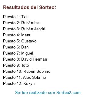 Lista de participantes: Manu, Kokyn, Rubén Isa, Txiki, Rubén Jandri, Toto, Gustavo, Dani, Rubén Sobrino, Alex Sobrino, David Herman, Miguel.