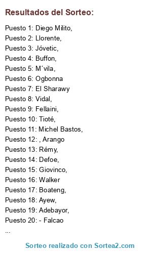 Lista de participantes: Jõao Moutinho ,, Witsel,, Akinfeev,, Di Natale,, Jóvetic,, Dedé,, Ogbonna, David Luiz,, Ramires,, Mata,, Handanovic,, Pirlo,, Vidal,, Buffon,, Cassano,, Chiellini,, Marchisio,, Sneijder,, Guarín,, Gargano,, Álvaro Pereira,, Filipe Luís,, Llorente,, Muniaín,, Cardozo,, Diego Milito,, Michel Bastos,, Gomis,, Rodrigo Palacio,, Demba Ba,, Papiss Cissé,, Cabaye,, Tioté,, Ben Arfa,, Fellaini,, Mavuba,, M´vila,, Huuntelar,, El Sharawy, , Lamela,, Boateng,, Robinho,, Adebayor,, Ayew,, Eriksen, , Mandanda,, Valbuena,, Rémy,, M´Bia,, Julio Césa, r, McGueady, , Emenike,, Hamsik,, Dzagoev,, Doumbia,, Honda,, Rui Patricio,, Insúa,, Capel,, Izmailov,, Miguel Veloso,, Raúl Meireles,, Felipe Melo,, Negredo,, Trezeguet,, Beñat,, ínan, , Arango, Mertens,, Klose,, Hernanes,, Martins., - Falcao, - Podolski, - Cazorla, - Walcott, - Etoo, - Neymar, Cavani,, Pato,, Giovinco,, Hulk,, Bale,, Defoe,, Hazard,, Torres,, Luis Suarez,, Cech, , Ashley Cole,, Walker.