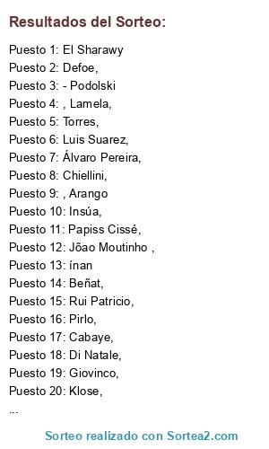 Lista de participantes: Jõao Moutinho ,, Witsel,, Akinfeev,, Di Natale,, Dedé,, Ogbonna, David Luiz,, Ramires,, Mata,, Handanovic,, Pirlo,, Cassano,, Chiellini,, Marchisio,, Sneijder,, Guarín,, Gargano,, Álvaro Pereira,, Filipe Luís,, Llorente,, Cardozo,, Michel Bastos,, Gomis,, Rodrigo Palacio,, Demba Ba,, Papiss Cissé,, Cabaye,, Tioté,, Fellaini,, Mavuba,, Huuntelar,, El Sharawy, , Lamela,, Boateng,, Robinho,, Adebayor,, Ayew,, Eriksen, , Mandanda,, Valbuena,, Rémy,, M´Bia,, Julio Césa, r, McGueady, Hamsik,, Dzagoev,, Doumbia,, Honda,, Rui Patricio,, Insúa,, Capel,, Izmailov,, Miguel Veloso,, Raúl Meireles,, Felipe Melo,, Negredo,, Trezeguet,, Beñat,, ínan, , Arango, Mertens,, Klose,, Hernanes,, Martins., - Falcao, - Podolski, - Cazorla, - Walcott, - Etoo, Cavani,, Pato,, Giovinco,, Hulk,, Bale,, Defoe,, Hazard,, Torres,, Luis Suarez,, Cech, , Ashley Cole,, Walker.