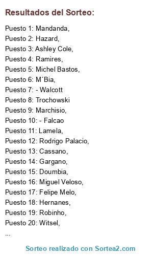 Lista de participantes: Witsel,, Di Natale,, David Luiz,, Ramires,, Mata,, Juanfran, Pirlo,, Cassano,, Chiellini,, Marchisio,, Sneijder,, Gargano,, Álvaro Pereira,, Cardozo,, Michel Bastos,, Gomis,, Rodrigo Palacio,, Papiss Cissé,, Tioté,, Fellaini,, Mavuba,, Huuntelar,, Lamela,, Adrian,, Robinho,, Eriksen, Mandanda,, Valbuena,, Rémy,, M´Bia,, Drogba, Hamsik,, Dzagoev,, Doumbia,, Honda,, Capel,, Izmailov,, Miguel Veloso,, Raúl Meireles,, Felipe Melo,, Negredo,, Trezeguet,, Beñat,, Klose,, Hernanes,, Martins, - Falcao, - Cazorla, - Walcott, - Etoo, Cavani,, Pato,, Giovinco,, Hulk,, Hazard,, Trochowski, Stegen, Ashley Cole,, Walker.