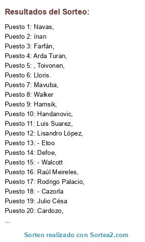 Lista de participantes: Jõao Moutinho ,, Witsel,, Akinfeev,, Di Natale,, Jóvetic,, Dedé,, Ogbonna, David Luiz,, Ramires,, Mata,, Handanovic,, Pirlo,, Vidal,, Buffon,, Cassano,, Chiellini,, Marchisio,, Sneijder,, Guarín,, Gargano,, Álvaro Pereira,, Filipe Luís,, Arda Turan,, Llorente,, Muniaín,, Cardozo,, Diego Milito,, Michel Bastos,, Gomis,, Rodrigo Palacio,, Demba Ba,, Papiss Cissé,, Cabaye,, Tioté,, Ben Arfa,, Fellaini,, Mavuba,, M´vila,, Lisandro López,, Lloris., Huuntelar,, Farfán,, El Sharawy, , Lamela,, Boateng,, Robinho,, Adebayor,, Ayew,, Eriksen, , Mandanda,, Valbuena,, Rémy,, M´Bia,, Julio Césa, r, McGueady, , Emenike,, Hamsik,, Dzagoev,, Doumbia,, Honda,, Rui Patricio,, Insúa,, Capel,, Izmailov,, Miguel Veloso,, Raúl Meireles,, Felipe Melo,, Navas,, Negredo,, Trezeguet,, Beñat,, ínan, , Arango, , Toivonen,, Mertens,, Klose,, Hernanes,, Martins., - Falcao, - Podolski, - Cazorla, - Walcott, - Etoo, - Neymar, Cavani,, Pato,, Giovinco,, Hulk,, Bale,, Defoe,, Hazard,, Torres,, Luis Suarez,, Cech, , Ashley Cole,, Walker.