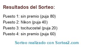 Lista de participantes: tocitucostel (puja 20), Nikon (puja 40), sin premio (puja 60), sin premio (puja 80).