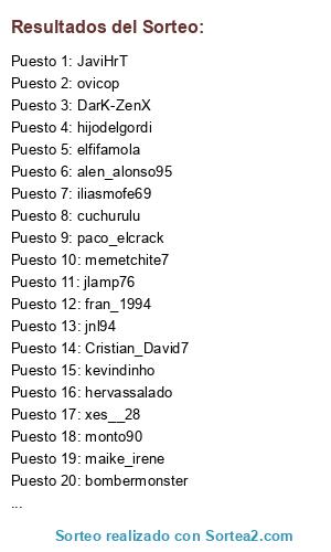 Lista de participantes: alen_alonso95, xes__28, arokita57, memetchite7, hervassalado, Nandetre, fran_1994, romanomad82, adris91, ReloK, markinhu6, bombermonster, cuchurulu, jlamp76, jnl94, maike_irene, blasinho, Maec-HM_93, DarK-ZenX, elcorso, Cristian_David7, paco_elcrack, pi69tu, hijodelgordi, iliasmofe69, maggiobrc, kevindinho, ovicop, JaviHrT, elfifamola, monto90, jordan_87_14.