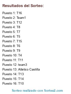Lista de participantes: Team1, Atletico Castilla, team3, T4, T5, T6, T7, T8, T9, T10, T11, T12, T13, T14, T15, T16.