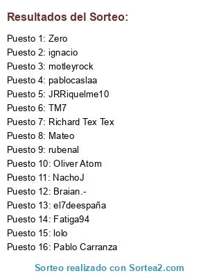Lista de participantes: Oliver Atom, Pablo Carranza, lolo, Fatiga94, ignacio, NachoJ, JRRiquelme10, motleyrock, Braian.-, TM7, Mateo, rubenal, Richard Tex Tex, Zero, pablocaslaa, el7deespaña.