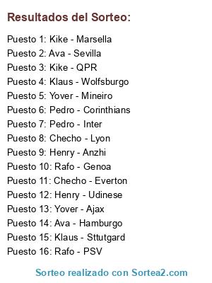 Lista de participantes: Checho - Lyon, Checho - Everton, Kike - Marsella, Kike - QPR, Rafo - PSV, Rafo - Genoa, Pedro - Corinthians, Pedro - Inter, Yover - Mineiro, Yover - Ajax, Henry - Anzhi, Henry - Udinese, Ava - Hamburgo, Ava - Sevilla, Klaus - Wolfsburgo, Klaus - Sttutgard.