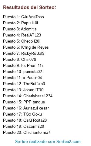 Lista de participantes: Adomitis, Checo l20l, Chicharito mx7, x Paulin04, RealATL23, Oscarms20, Fs Prior i11i, TheBuffalo0, RickyRoBal9, PPP tanque, Papu i10i, pumista02, K1ng de Reyes, JohanLT30, CJuAnaToss, Chiri079, Auriazul cesar, Charlybass1234, TGx Goku, QsQ Roita28.