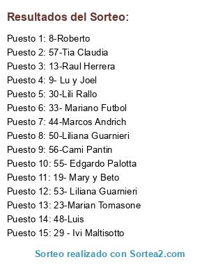 Lista de participantes: 1-Raul Herrera, 2-Noelia Tomasone, 3-Fernando Futbol, 4-Pelado Futbol, 5-Lu y Joel, 6-Nona Teresa, 7-Luciano, 8-Roberto, 9- Lu y Joel, 10- Emiliano Maltisotto, 11- Monica 3DG, 12- Mary y Beto, 13-Raul Herrera, 14-Adrian Futbol, 15-Martina Herrera, 16-Daniel Rivero, 17-Facundo Tomasone, 18-Dario Futbol, 19- Mary y Beto, 20-Ivi Maltisotto, 21-Charly Tomasone, 22-Monica Seriani, 23-Marian Tomasone, 24-Ludmila Tomasone, 25- Daniel Rivero, 26- Emi Maltisotto, 27-Pulpo, 28- Nona Teresa, 29 - Ivi Maltisotto, 30-Lili Rallo, 31-Lili Rallo, 32- Lu y Joel, 33- Mariano Futbol, 34-Mary y Beto, 35-Mary y Beto, 36- Lu y Joel, 37- Fabio, 38- Tia Claudia, 39-Miriam, 40-Marcos Andrich, 41-Cristina, 42- Miriam, 43- Liliana Rallo, 44-Marcos Andrich, 45-Soledad, 46-Claudia Tomasone, 47-Liliana Rallo, 48-Luis, 49-Eduardo, 50-Liliana Guarnieri, 51- Tia Claudia, 52- Nahuel Sotelo, 53- Liliana Guarnieri, 54-Edgardo Palotta, 55- Edgardo Palotta, 56-Cami Pantin, 57-Tia Claudia, 58-Edgardo Palotta, 59- Liliana Guarnieri, 60-Gustavo Arrestia, 61- Agustina Torres.
