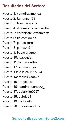 Lista de participantes: ramonrealainhoa, mayalmendros, jessica.1995_24, julietajuanma, mariaparper57, lacaraguapa, yarlindl, thaisymanuel, angelahg18, ayatamara4, pilargola, taniamg123, isabeli72, badiolaraquel, silnani, rodriguez.jose62, mamadedosprincesas11, jgmz15, ro_carnavalera, evaduran27, sandra_ms82, virginia_aragon, sonreir_juntas, vickymadridista, mamimolona29, 23caroli, mamideisabella, jenii_noriiega, badiolaraquel, cafefe84, kristf, juanpinwino, tamarina_39, slopezcuevas40, cameliia.jimenez, tonirodriguez_3, mariisaycriistiian, mamamatilde08, la.maraviillas, laura.garciaa16_, srta.garcia_13, b.a.r.r.u.l.092, sandra.suarezzz_, morenikaaa27, distribuidora_avon_24, rociocuello1995, unicornioo.es, mjruuiiz_01, paquicantalejo, saritta_110114, vistorieta, marnp15_29, srt.montoya06, arabitacer, escuuderoo, sin.sentimiento0, nadia_aracelli, jenny.stefany, sbenaventefoto, aaalbapardooo03, vanessaycasiano, merchyotero, martalmazo, veronicatellezsanchez, m.milagros55, betytorres, 23caroli, dieguito_kitty_vichy, acinorev222, yurena.hdz, isacortesdetorres, silviagalindogarcia, routheeerr.16g._, nagojm_atrapando_un_sueno, rosilunamontero, genesisaraih, rodriguez_encarna, angelitapb1965, belenzapatero, fofumarimen, carmentomaas, cemaca94, aliciaxl____, paulayantonio_22, desireejesusgomez, morena_caz, kary_amil, gemazc91, reyes__________, danielafernandez9348, cristianyandrea7, beabarrantes24, manoli.valdes, martalmazo, acinorev222, virghynia, sorayacd96, doloresjimenezcarrilllo, gabrielita0227, lapekecantabracrespo, reme_bolera, gabrielita0227, sweet_home_tras, mariajosevillegassanchez, lidiamacarena, paqui.20, antoniaafernandezz_1, ivy.intheworld, juliataibo, cristiiniita, layayayoyo, laia8sa.