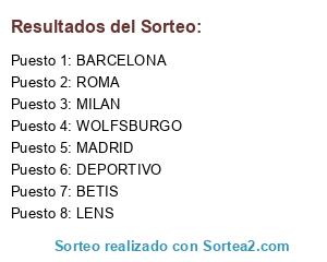 Lista de participantes: LENS, WOLFSBURGO, MILAN, DEPORTIVO, BARCELONA, BETIS, ROMA, MADRID.