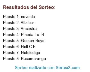 Lista de participantes: Altzibar, Hell C.F., Pineda f.c -B-, novelda, Bucamaranga, Gerson Boys, Ancestral, Notelodigo.