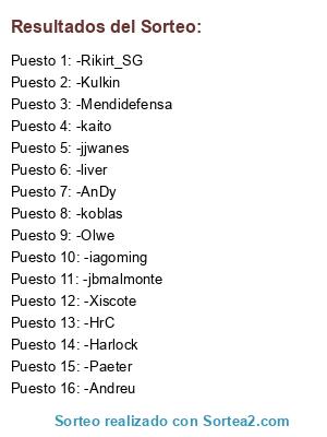 Lista de participantes: -Rikirt_SG, -Harlock, -iagoming, -liver, -Xiscote, -kaito, -HrC, -Andreu, -jbmalmonte, -AnDy, -koblas, -Kulkin, -Paeter, -Olwe, -Mendidefensa, -jjwanes.