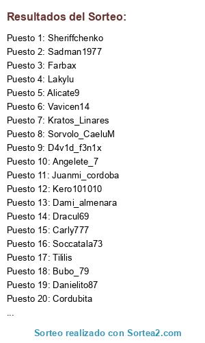 Lista de participantes: Farbax, Pes_lolito, D4v1d_f3n1x, Dracul69, Jaimeig, Kratos_Linares, Jorgelm7_CaeluM, Ferrari_4567, Fer_Don3p, Twisterswar, valle__17, Soccatala73, Alicate9, Huied, Xavx30, Carly777, Cortex_xx, Makaroov69, Cordubita, Juanmi_cordoba, Lakylu, Sheriffchenko, Pescaito22, Mimiaguero, DavidYinyer, Danielito87, Tililis, Bogarde9, Dami_almenara, Kero101010, Sorvolo_CaeluM, Sadman1977, Amortee, Vavicen14, Angelete_7, Bubo_79.