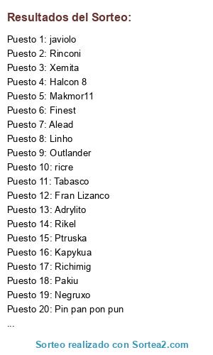 Lista de participantes: Linho, Tabasco, Pin pan pon pun, Halcon 8, Xemita, Outlander, martincaceres, Makmor11, Rikel, Finest, Fran Lizanco, Richimig, Kapykua, Adrylito, Alead, Negruxo, ricre, Ptruska, Pakiu, Rinconi, javiolo.