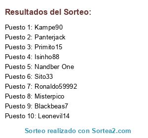 Lista de participantes: Leonevil14, Sito33, Misterpico, Ronaldo59992, Blackbeas7, Panterjack, Nandber One, Kampe90, Isinho88, Primito15.