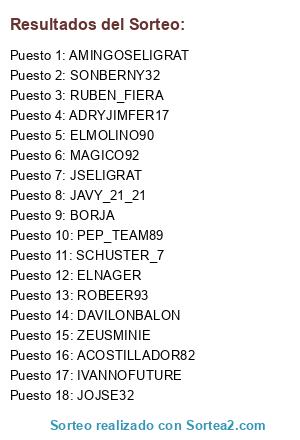 Lista de participantes: IVANNOFUTURE, JOJSE32, DAVILONBALON, PEP_TEAM89, JAVY_21_21, SCHUSTER_7(2 participaciones), RUBEN_FIERA(3 participaciones), ACOSTILLADOR82(4 participaciones), ROBEER93(5 participaciones), ELMOLINO90(6 participaciones), ELNAGER(7 participaciones), JSELIGRAT(8 participaciones), MAGICO92(9 participaciones), BORJA(10 participaciones), SONBERNY32(11 participaciones), ZEUSMINIE(12 participaciones), AMINGOSELIGRAT(13 participaciones), ADRYJIMFER17(14 participaciones).