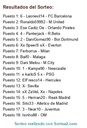 Lista de participantes: 1 - Kampe90 - Newcastle, 2 - DaniGomez90 - Bor.Dortmund, 3 - Near10 - Juventus, 4 - Panterjack - R.Betis, 5 - Hernan20 - Reak Madrid, 6 - Leonevil14 - FC.Barcelona, Ronaldo59992 - M.United, x karloS 5 x - PSG, Isinho88 - OM, Ese Cadiz Oe - Orlando Pirates, Baif0 - Malaga, Sito33 - Atletico de Madrid, ElFresco14 - Hercules, xX ZaVeL Xx - Napoles, Xx SpeerS xX - Everton, Dani Melou - M.City, Ferborrus - Milan, X- Sevilla.
