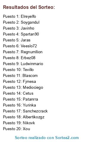 Lista de participantes: Erbez08, Spartan90, Tevillo, Regnumllion, Cetus, Mediociego, Javinho, Xou, Jaras, Patanrra, Nikovk, Fjmesa, Yurinka, Elreyelfo, Veeslo72, Soygandul, Albertikozgz, Blascom, Sanchezcrack, Ludwinmario.
