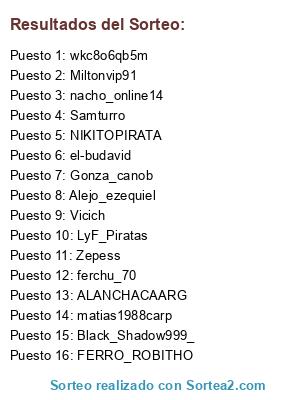 Lista de participantes: Javicr720912005, FIFA_FECHE, Rodrygo10, Pilus23, zaraguiang14, facuherrera10, LeoBonatti1976, xox-marcelo-xox, Jeo-riogallegos, Trezeguet32, sportivoitalia82, sombra9_pro, Turu1011, Imferrus, EzeP-08.