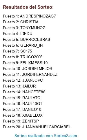 Lista de participantes: JORDIELMEJOR, TRUCO2006, NAHCETE86, TONYMUNOZ, DANILO10, ZENITSP, JORDIFERNANDEZ, GERARD_IN, SC175, RAULATO, CHRISTIA, FELIXMESSI10, RAUL10GT, JUANJOPC, JAILUR, IDEDU, X0ABELOX, JUANMANUELGARCIABEL, ANDRESPINOZAG7, BURROCEBRAS.
