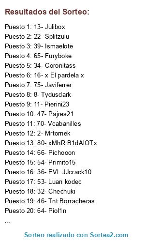 Lista de participantes: 1- Alvarosc, 2- Mrtornek, 3- Redox07, 4- Sewillista, 5- Rubo691, 6- Mrtsgi, 7- Infernacos9pol, 8- Tydusdark, 9- Baldoraul, 10- Danibox7, 11- Pierini23, 12- Chekbo, 13- Julibox, 14- Cipry, 15- Romelio, 16- x El pardela x, 17- Ikki77fenix, 18- Albertomalaka10, 19- Manvicio, 20- Hullshulk, 21- Giovanoti90, 22- Splitzulu, 23- Itachi 360, 24- Malakantonio, 25- Aleiviii, 26- Kapykua666, 27- Rllatas, 28- Fransolo, 29- Kfeco, 30- Treckus, 31- Xabusa, 32- Chechuki, 33- Ivancii, 34- Coronitass, 35- Blademan76, 36- EVL JJcrack10, 37- Latviano, 38- Danipedrolo, 39- Ismaelote, 40- Jmmspain2, 41- Jose vicio, 42- Marcosrg, 43- Emiliheineken, 44- Tortxu360, 45- Rubi146, 46- Tnt Borracheras, 47- Pajres21, 48- Sunkitoo, 49- Icaropub, 50- Perizgz, 51- Near10, 52- Deilik42, 53- Luan kodec, 54- Primito15, 55- Howsitgon, 56- Celorios, 57- Ayo83xbox, 58- Csklonn, 59- Javifig29, 60- Pelotasso2, 61- Karrique, 62- Verdantplayer, 63- Zefi, 64- Piol1n, 65- Furyboke, 66- Pichooon, 67- NoxMAN28943, 68- Eldegallegos85, 69- Ganchote, 70- Vcabanilles, 71- Borja ESP, 72- Danielin10, 73- Rorri85, 74- Gallind, 75- Javiferrer, 76- Jotaele256, 77- MalparHoiPoi, 78- Jascito, 79- Kenstall, 80- xMhR B1dAlOTx.