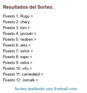 Lista de participantes: Rugu >, rwaben >, vifu >, alex >, toni >, Jomalk >, ostrix >, javizaki >, oskis >, sapo >, carnedebil >, chery.