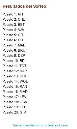 Lista de participantes: BRI, RED, LCE, ARS, LEV, CHE, DOR, VAL, VIL, WUH, BRU, RAN, MAR, UNI, BAR, AJA, PAU, PSG, BAY, RAY, MAL, DEP, ESP, GIR, OSA, BET, CEL, CIT, SEO, LEI, LED, NAP, ROM, VIG, TOT, MAD, WAT, WOL, SHE, ATH.