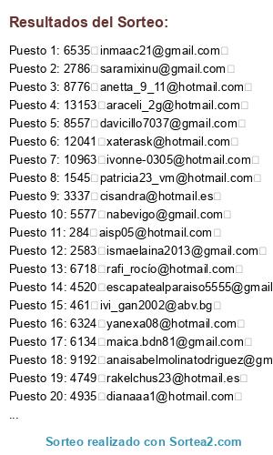 Lista de participantes: @.al, @diezcirizasusana, @mariajocc82, @cintisuarez20071989, @txominsantuaran, @joseluisgomezsobrido, @olayadp, @turceline1, @noeliafm1990, @tefymagg, @cintiasa5, @omauxyy, @antoniafercam241989, @antonia2992, @munozpanosc, @souadelamari31, @ezeke69, @liliana8867, @anitababylon, @carolinayjesusalejandro, @carla_palmeres, @carlacanales23, @loli_tic, @laleyalba26, @iria_airi_8, @bolitadiabliyo, @miamoor2014.la, @vircho85, @djamador95, @johannazx7, @iriabarreirofelipez, @johannazx, @demelrodriguez, @erikaleix23, @sadonar_2, @evachannel73, @itsu16, @melanyosorio25, @aleks.hernandezp, @aritacordova, @ruby_tello, @patri_lazo, @almabella88, @agotsiev, @mag.twitter68, @okovalchuk.ok, @saioar40, @montserratsubinya, @cheila.com, @jesy86, @sala__anna, @sonia.sanchez.gomez, @mise_fernanmata, @ruth_velascom, @lauramaciasnami111, @calilu95, @estherpj_20, @rllanogarrido, @morby88, @ana2023, @sara.leonor.torres, @cristinapuebla10, @cris_segest_14, @rosaramos64, @conkadek2, @vejo_84, @yohannacm, @b_renedo, @azagume, @lomorpe, @adyelena44, @salondebellezaabril, @steladimare84, @estrellipc, @chiotiky, @albichuli86, @andreabautistaromero, @apc.25.rf, @nilacarmona, @rodriguezk852, @vegacaballer, @laura.urreap, @ixorreta, @dani_bdn_69, @belerus85, @saudynataly, @info, @karinet30, @rebecavelez, @oanaluiza, @laura1669.lh, @noeliaaldi, @luciatorralbaregos, @montsebule, @margonzaleman, @carmen.deltiempo, @mofidan, @babylebrijana, @gabrielamadricor, @iris_gomez89, @lorenacruzcruz6, @anahialex4, @iresuss, @angiospermas, @mabel.galvez32, @miren_salegi, @bambiyflor, @marina.sosa.grande, @laurasilvadona, @jess_02_02, @miriammoralesesteban1998, @begobp1983, @francinefemalefitness, @hospimovil_19, @diossteama12345, @dayaxi, @albertoglam, @roci_16_mickey, @inmavaronaonieva, @dolo_jumilla, @rominasanmartinpallas, @superqueso30, @lorenaivi, @rosabrian2013, @ioanpampu, @s_reguera, @oliviacg_24, @miniduni2007, @viki.ton, @olivia_casga, @mariapilar_1983, @wiamhicham, @carla.adopciones, @lauurahya, @lorenacamposmatos, @noeliavr00, @irenekalandrakas, @onefra, @deysigomez1107, @carpentediazdaniel, @ledesmacarme84, @salvadoramartinez, @blancaferreres94, @rubia_r6, @molina_m15, @montsegonzalez88, @sampimolina, @i_love_y21, @mnyfdez, @anapisonero, @patagu_19, @mgimenezm80, @abrialesalvarez, @zape1411, @mery.rojas1979, @eneida-gf, @albedela, @katherinecamacho0112, @akiraycane, @indecas, @sandrahurtado1999, @raquelmolineropelaez, @azumagallon, @alaznelaffage, @bea180191, @bebe1805, @mafecitavargasc, @jasminagomezloro, @jmunoztuduri, @anacristinadecn, @maria.lencina1, @macafran21, @rociomoleros, @lucia_hornero, @rebecc_pint22, @cristinamtez81, @mrsousa84, @wassila.5, @dalilaelizabethbenitezbenitez, @sajenejoja, @antonioescudero799, @miriam_vazwuez1, @j3ssi3, @laurarangeljramillo, @raquenume, @grisethps, @lau-cato, @leticiamartinezceada, @alikram00, @erikaestevezlamas, @anabel.freire, @valkiriaesteticista, @cris_sanch19, @mimy20iglesias, @rebecaher91, @virwynnet, @yurenagl_29, @lezgijon, @gemaespejo, @ana132.95, @chus_111, @zai_diegues, @patriciajimdoms, @gabrieldiazpalos, @agthum, @info.rebecarobledo, @marymary-85, @crcastro84, @sarita519, @nowe_bs, @pepimacrespillo, @cynthiaelizabethsoler, @annika_1986_, @adrianmapi20, @zozo3891, @bmassarinolan, @lupyta.85, @nancysanchezpagel, @aitorlm86, @soniapc86.sp, @cnar18, @naiara_malaga, @mar_0069, @antonia082017, @mabelxea, @desireemorenorodriguez23, @amparo_oc, @gemaps6, @virginiajh11, @stargate.chan.sg1, @pierregil_sup, @bmdemar, @eugeniapazos, @amgieeme, @lm_mendez, @anikoide, @lauraturco, @yaras_25, @griseldabrillas, @vhlr2, @desire_da7, @teresapicazo7, @coissafofa, @nuriamadrid1520, @inmamartin79, @pao__llrns, @amandasencio.l, @churry92, @albatorrejon, @carolandgc, @rogolo76, @rabelbor, @pamelayeseniaquesadagamboa, @chalu1977, @portaslu, @sonia-carrasco, @anamcarrerasm, @alexa_barrue, @romina___82, @rocioserranogonzalez, @iaminsalcedo.premier, @martafc81, @michaela2011, @nalburquer, @alisanchez_29, @sojamarpt, @sexybeach.mym, @mjrguez80, @preguntamesobreamor, @almucc19, @huescar1c, @day240895, @lorenagutierrezraya, @nuriacascales87, @mariluigargon, @164938633, @lidiajimeneznavarro25, @mapizalo, @inmaculada84, @deborahrueda_, @lokiya88, @micaelaluna, @mariaespadas_88, @aisp05, @anuk_01, @salore25, @martika948, @pautent, @elemamu, @maria.quintans, @lgonzalez, @rglourdes89, @dsolana, @estefi.torre, @teresamartinmenor, @crishernando, @loli_25_3, @tamaramerino36, @inesalbistur, @nataliungui, @martalmassora, @maite.cortes.carrasco, @vicky26_aniturs, @palomalberolamirambell, @luciagrvr, @anaxjx, @ni_ka14, @lurde2006, @salgary2, @maria.rguezacosta, @elenaromerocano30, @srodriguezgonzalez77, @weenajimenez, @mairim1998, @mireiabbe, @cristinacguerrero, @ml.lomet, @brendavanessavonborries, @vigama15, @adriana.glez84, @mjarias2376, @alicia.abaddiaz.73, @mayteobregonsalon, @sabia_naturana, @beatrizinvierno, @aigomezgomez07, @slg1877, @karencristhian2208, @alba_1988_bcn, @jablisonia2000, @tamyre, @dianuky, @alexarinaymucu, @acrucessanchez, @sonia_ac84, @merce.velasco, @vanemarbu, @ntorrestorres, @lgpinedo05, @tamararofe, @rake_156, @yoligmll0d, @pmoralestorres02, @lasoraya2015, @raul.18.villena, @ariadna, @mjjmnino, @marilocuevassoto, @lorena.garcia.8, @carmorosil, @gaita.86, @garciaarizmendicarlos, @ilsevangestelster, @iresazo, @jherhid, @yasmiina.277, @rociofernandezrubio18, @laura.mate.due, @lidis.sb9352, @aurora.ygallach, @maria, @irenemanuel, @elviradiazperez, @irenemanuel, @nostressfrb, @ami.taphigaye, @brokil17, @diana.villagrasa, @belenlorenzoa, @monicadelafuente0204, @maitegarcia2689, @miriam.montesdeoca.santana, @taya_1726, @macarenafgl, @meriemyasin85, @fatimabenisa, @rockito_l, @ramirezramirezc93, @maria.rayo, @estefaniasanchezlujan, @okunycn, @lalyjonyyelpeque, @bacalao2016, @enana_89, @ainhoa.suso.8, @natacu172, @cuaja17, @monmera, @ana_crisspain, @leles.lopezparejo, @janireruiz7, @trinicargasflores, @patryr_82, @alejandragutierrezgarcia0890, @patrii_ibz, @silvia.la