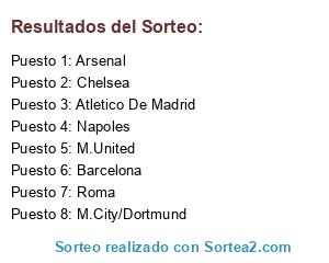 Lista de participantes: Arsenal, M.United, Chelsea, Roma, Atletico De Madrid, Napoles, Barcelona, M.City/Dortmund.