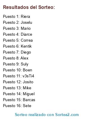 Lista de participantes: Miguel, Barcas, Mario, Diego, Diarce, Alex, v3sTi4, Mike, Joselu, Josito, Kentik, Sete, Correa, Suly, Riera, Boen.