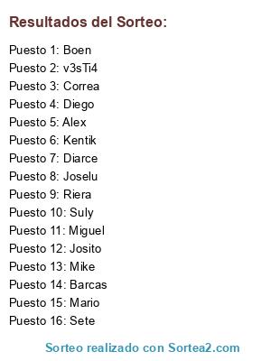 Lista de participantes: Miguel, Barcas, Mario, Diego, Diarce, Alex, v3sTi4, Mike, Joselu, Josito, Kentik, Sete, Correa, Suly, Riera, Boen.