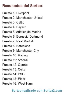 Lista de participantes: Eibar (5), West Ham (7), PSG (8), Racing (12), Liverpool (15), Borussia Dortmund (18), Manchester United (24), Celta (30), Arsenal (40), Atlético de Madrid (50), Real Madrid (61), Barcelona (80), Bayern (110), Manchester City (140), Celtic (180), Oporto( 220).