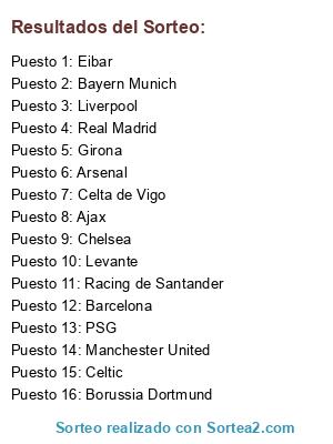 Lista de participantes: Eibar, Racing de Santander, Celta de Vigo, Real Madrid, Arsenal, Girona, Manchester United, PSG, Liverpool, Borussia Dortmund, Bayern Munich, Ajax, Chelsea, Barcelona, Celtic, Levante.