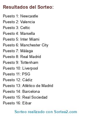 Lista de participantes: Atlético de Madrid(15), Málaga(61), Manchester City(180), Newcastle(110), Barcelona(18), Marsella(40), Celtic(140), Eibar(8), Liverpool(12), Real Madrid(80), Cádiz(24), Valencia(220), PSG(7), Real Sociedad(5), Inter Miami(30), Tottenham(50).
