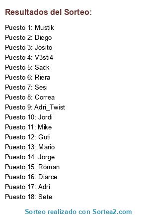 Lista de participantes: Jorge, Adri_Twist, Adri, Jordi, Diarce, Mike, Riera, Roman, Mario, Mustik, Diego, Sesi, Josito, Guti, Sack, Correa, Sete, V3sti4.