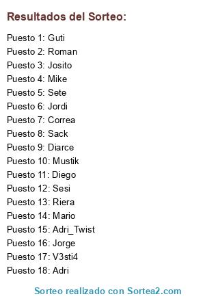 Lista de participantes: Jorge, Adri_Twist, Adri, Jordi, Diarce, Mike, Riera, Roman, Mario, Mustik, Diego, Sesi, Josito, Guti, Sack, Correa, Sete, V3sti4.