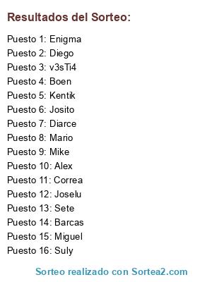 Lista de participantes: Miguel, Barcas, Mario, Diego, Diarce, Alex, v3sTi4, Mike, Joselu, Josito, Kentik, Sete, Correa, Suly, Enigma, Boen.